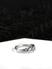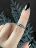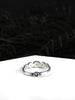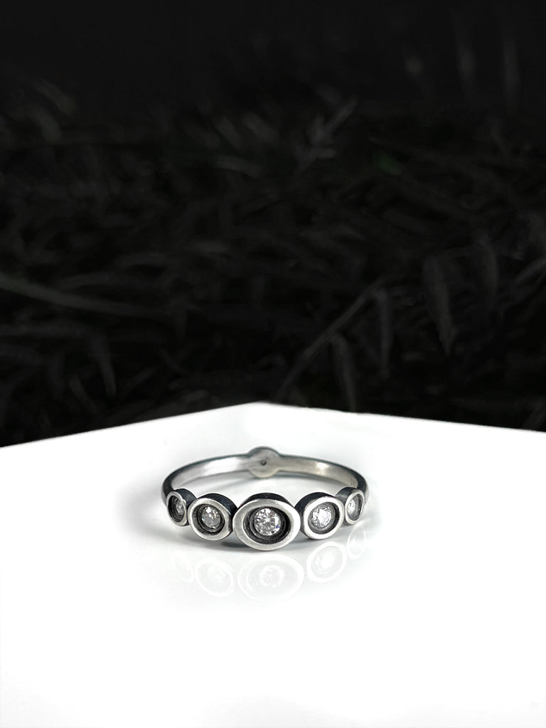 Dainty and cosmic, this ring features a row of five sparkling flush set moissanite stones, and a secret one in the palm. Wears well as a stacking ring or on its own.