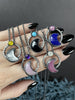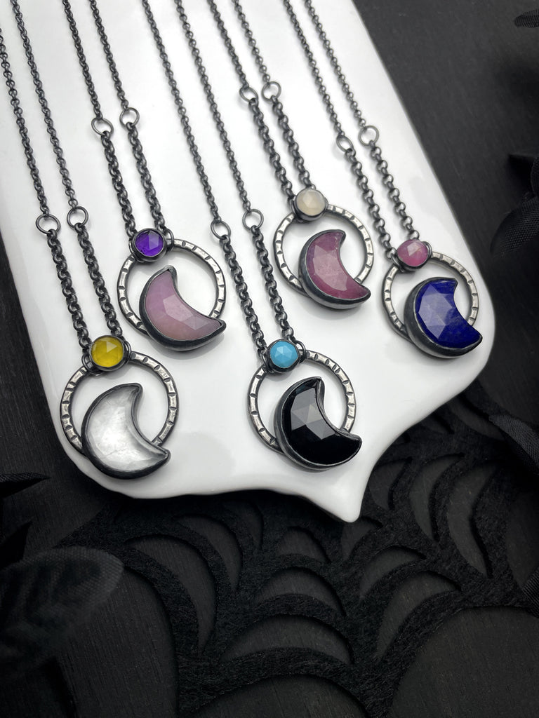 Sweet and celestial, these twinkling crystal moon pendants were crafted by hand in blackened silver. The stones pairings are as follows: