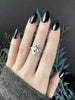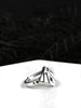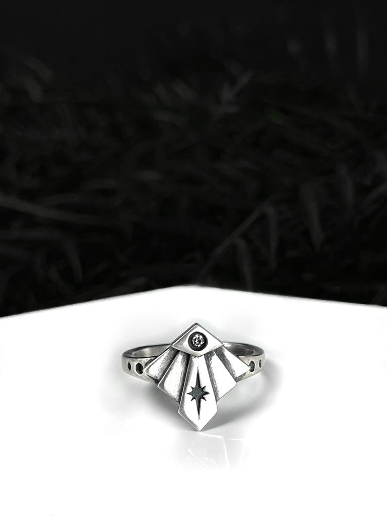 A very outer-spacey art deco style ring featuring a ufo with sparkling moissanite center and starburst.
